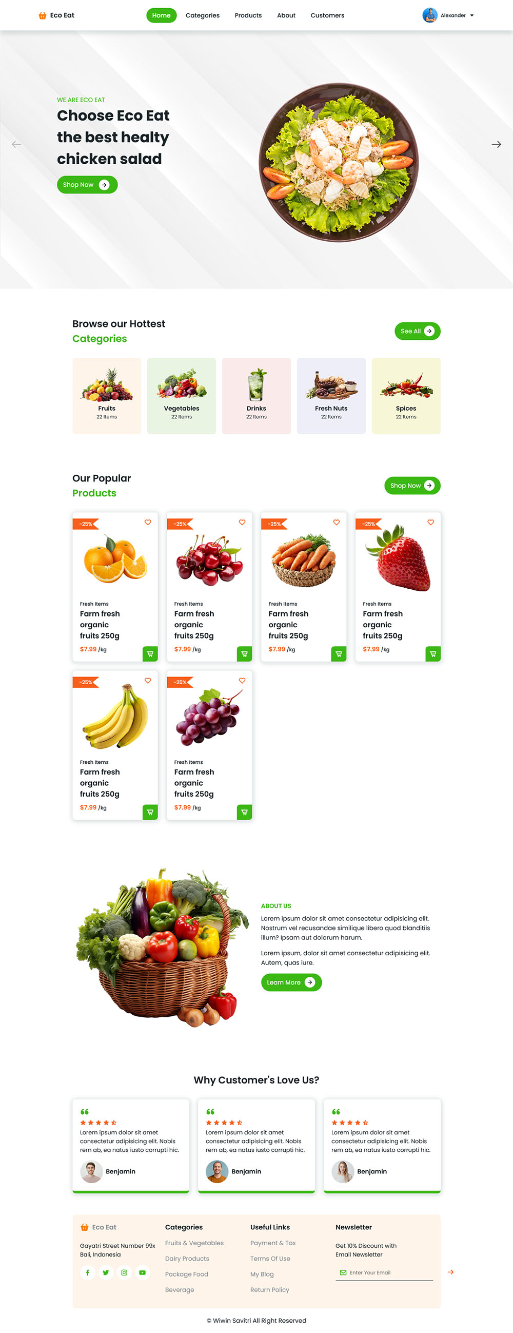 Eco Eat adalah platform e-commerce yang menyediakan berbagai macam buah dan sayur segar dengan kualitas terbaik. Dengan tampilan yang modern dan responsif, website ini memudahkan pelanggan untuk menemukan produk favorit mereka, menambahkan ke keranjang belanja, dan melakukan checkout dengan cepat.