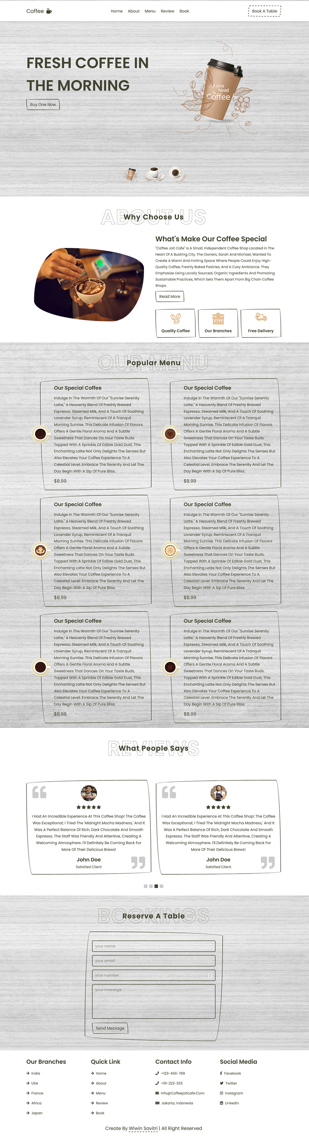 Landing page yang menampilkan coffee shop dengan desain minimalis, bersih, dan elegan. Dengan dominasi warna putih yang memberikan kesan segar, situs ini berfokus pada kejelasan informasi dan kemudahan navigasi. Pengunjung dapat dengan mudah melihat menu kopi, penawaran spesial, dan lokasi coffee shop, serta melakukan pemesanan dengan antarmuka yang sederhana dan responsif.