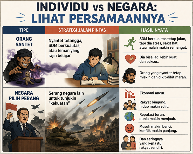 Bayangkan ini: ada dua tipe “pemain jalan pintas” di dunia. Yang satu individu, yang satu negara. Yang satu pakai santet, yang satu pakai perang. Keduanya punya satu kesamaan besar: malas kerja keras tapi pengen hasil instan.